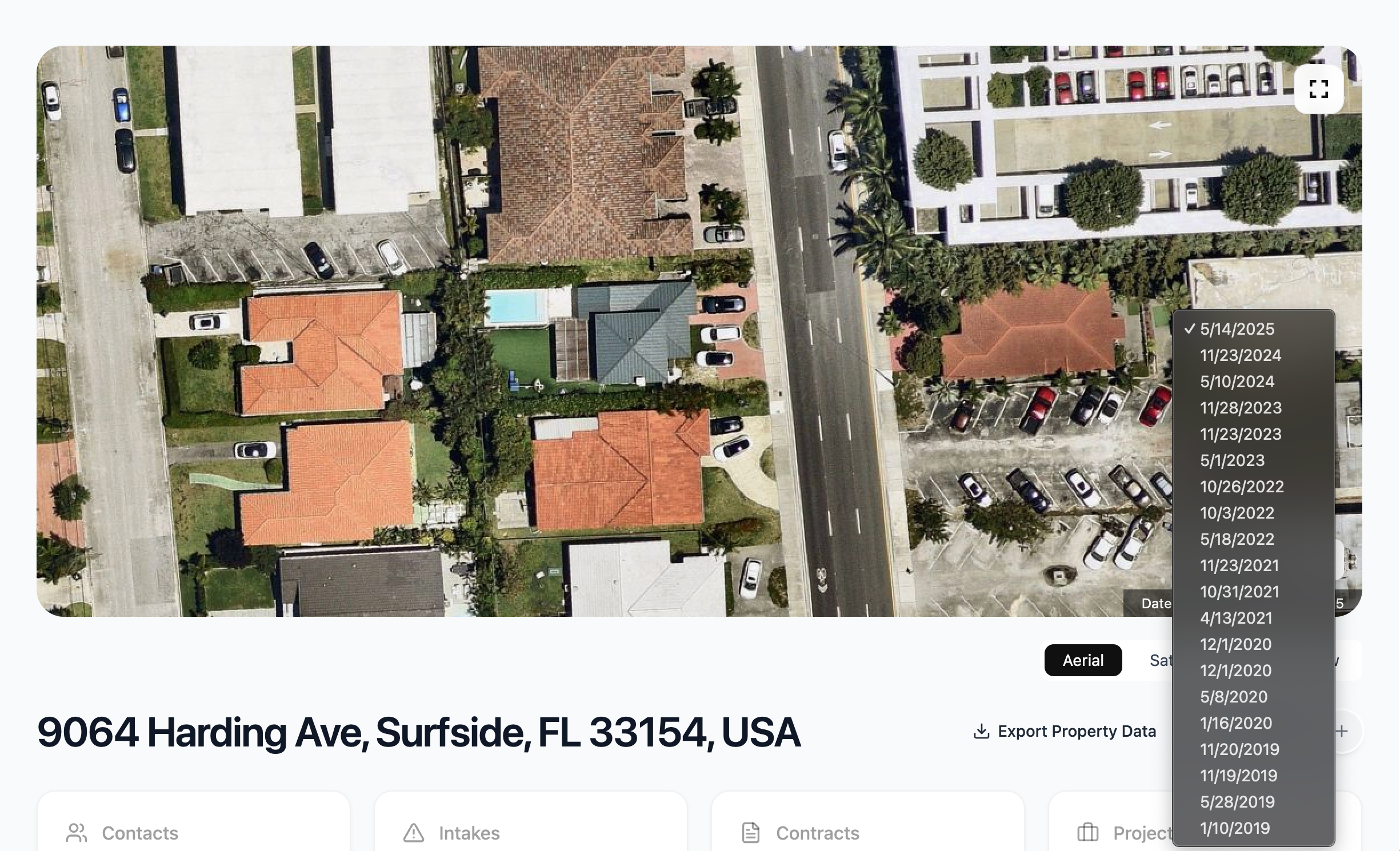Historical aerial imagery is a series of high-resolution photos captured from above — typically by airplanes, drones, or satellites — showing a property at different points in time.