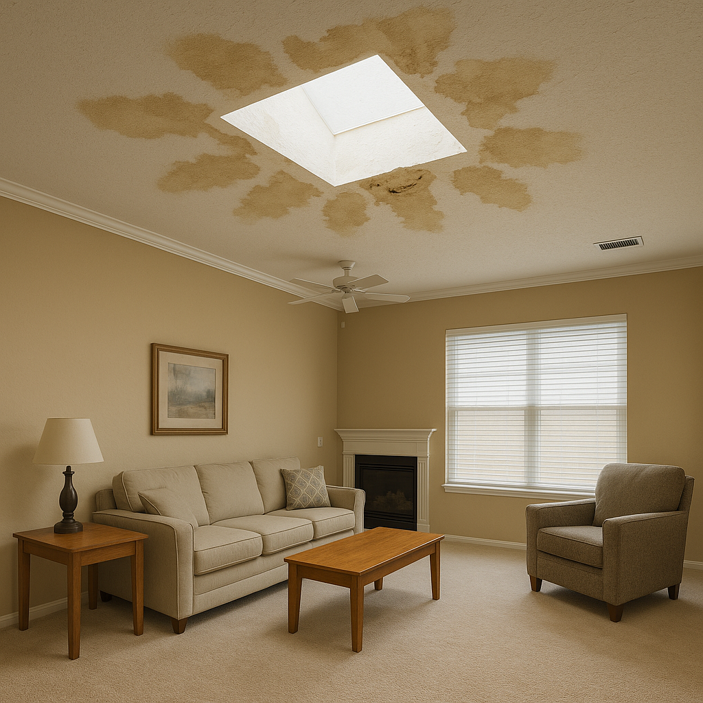 "Now in the main living area. The skylight seems to be the source of the main lea..."