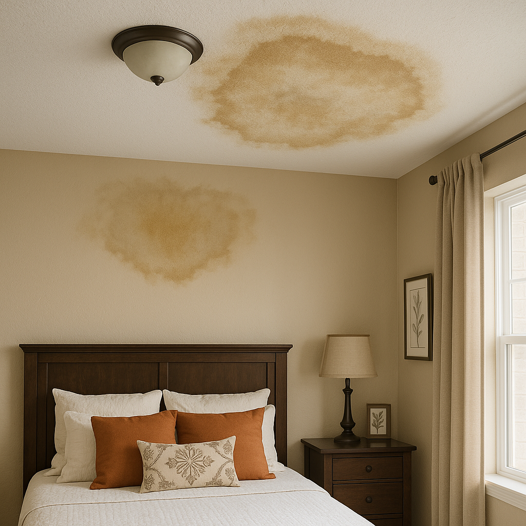 "Okay, starting in the master. Looks like we have some water staining on the ceiling, probably from that storm last week... you can see it in the corner there. It's about, I'd say, three feet wide. Taking a picture now... The drywall is soft to the touch. No other visible damage in the bedroom."
