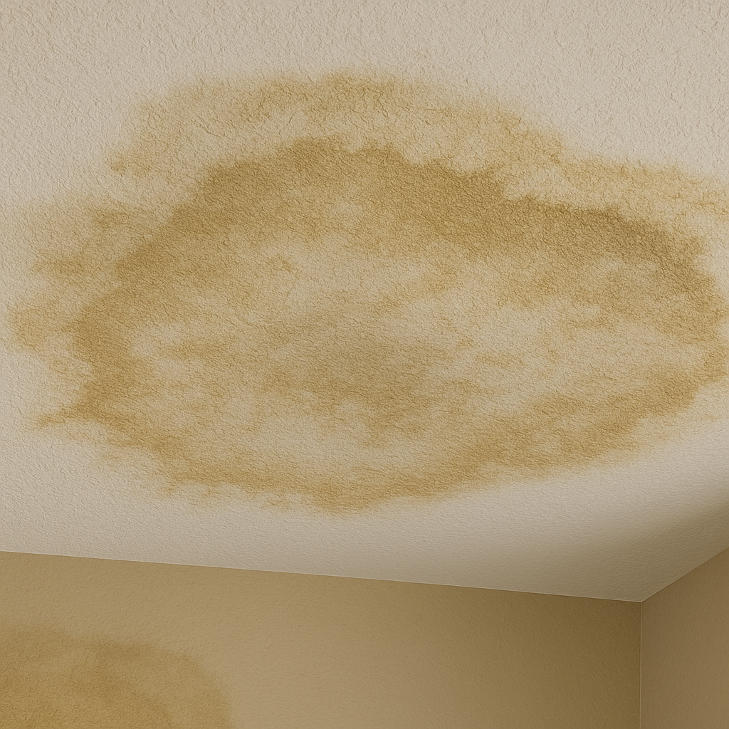 Water staining observed on the master bedroom ceiling, spanning approximately 3 feet in width. The damage appears to be recent, likely correlated with last week's storm. The affected drywall is soft, indicating moisture saturation. No other damages were noted in this room.